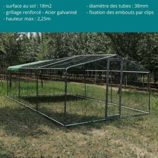 Trois solutions existent, le filet, le grillage et le parc grillagé, la troisième étant la plus sécurisée. Ce modèle de 6 mètres de long sur 3 mètres de large et 18 m² de surface au sol offrira à vos volailles un grand espace de liberté.