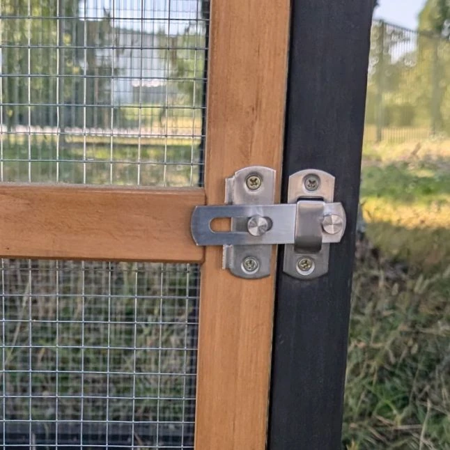 Les parois du parc sont constituées de grillage en acier galvanisé avec des mailles de 13 x 13 mm. Ces dimensions sont parfaites pour assurer la sécurité de vos poules. La structure repose sur des montants de bois robustes qui garantissent sa stabilité et sa durabilité.