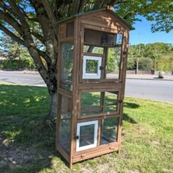 Un perchoir se trouve à l’entrée de chaque alcôve. Les 6 nichoirs sont répartis sur deux étages qui sont tous les deux munis d’un tiroir à déjections en métal, très pratique pour nettoyer rapidement l’habitat de vos oiseaux.