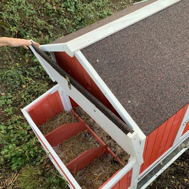 Le toit situé sur le dessus du pondoir peut s’ouvrir. Cela facilite l’accès aux œufs lorsque vous souhaitez les ramasser. Vous pourrez ouvrir ce toit de pondoir en été pour faire circuler l’air dans l’habitat de vos poules.