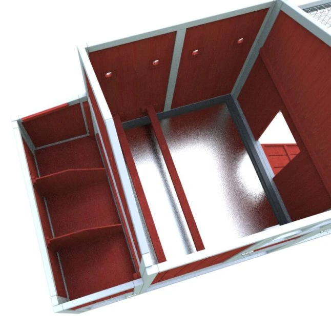 Vous trouverez ainsi trois ouvertures au niveau de l’enclos grillagé et deux accès sur la partie cabane, dont une porte qui se ferme avec loquet et une autre entrée qui donne sur l’échelle à l’intérieur de l’enclos.
