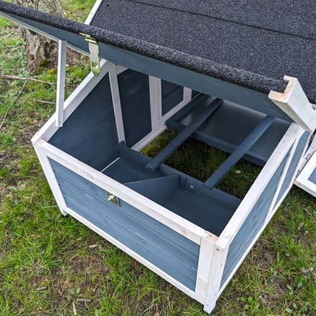 Diviser en deux nichoirs, le pondoir possède un toit séparé et est ainsi accessible de l’extérieur. Cette astuce simplifie grandement la récolte des œufs. Autre accessoire bienvenu, le tiroir à déjections en métal facilite l’entretien de la maison de vos poules.