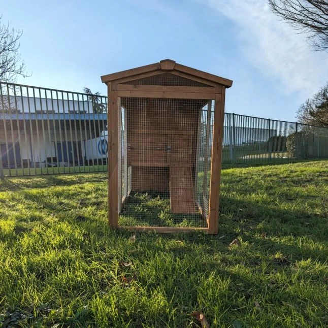 Son enclos grillagé est en métal galvanisé, parfaitement résistant à la rouille. Il supportera très bien la vie au grand air.