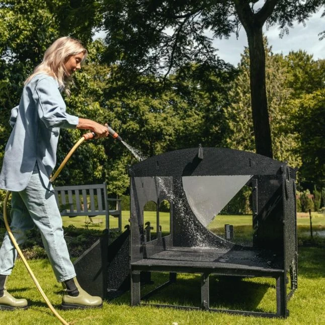 Un tuyau d’arrosage ou un nettoyeur haute pression sont les outils recommandés pour garder cet abri, qui sèche vite au soleil, bien propre.