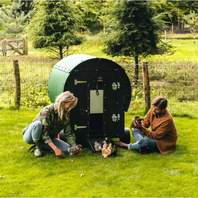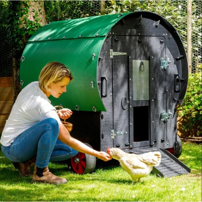 Conçu au Royaume-Uni avec une esthétique inspirée du Far West, il est monté sur roues pour un déplacement aisé. Il peut accueillir confortablement entre huit et quinze poules en toute sécurité.