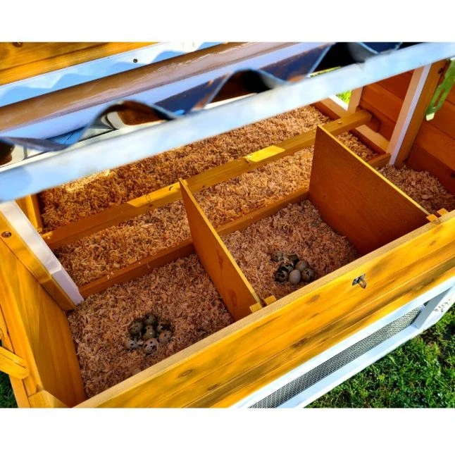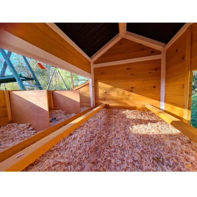 Placée en hauteur, la partie nuit est ainsi mieux isolée du froid et de l’humidité du sol. Vos poules y grimperont à l’aide d’une rampe en bois et trouveront à l’intérieur deux perchoirs ainsi qu’un pondoir séparé en trois accessible de l’extérieur.