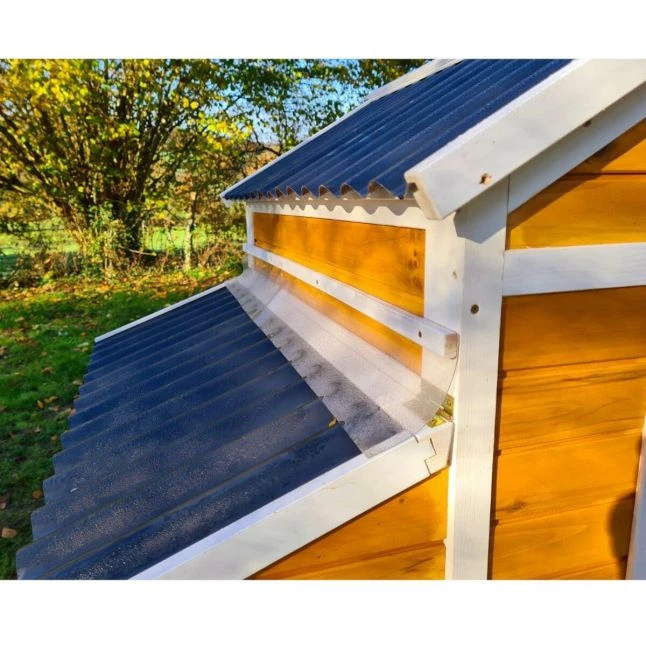 L’abri à volailles est couvert de plusieurs toitures à débords, toutes en pentes afin de rendre l’écoulement de l’eau de pluie plus facile.